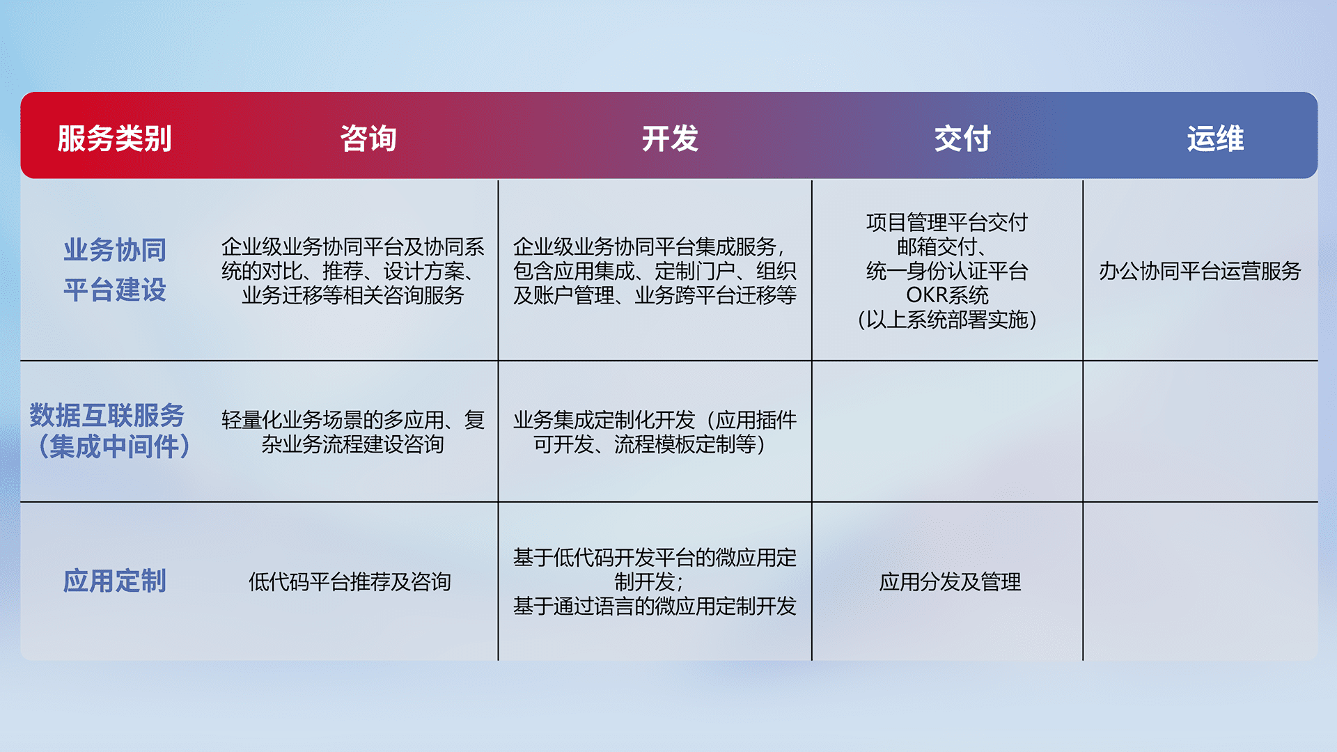 针对钉钉、、、、企微、、、、IDaas等平台级产品提供产品的规划、、方案、、交付、、、定制化开发等服务,,实现如统一协同办公、、智能客户服务、、混合会议管理、、、智能数据查询、、等业务场景,,,实现数字化转型。。
